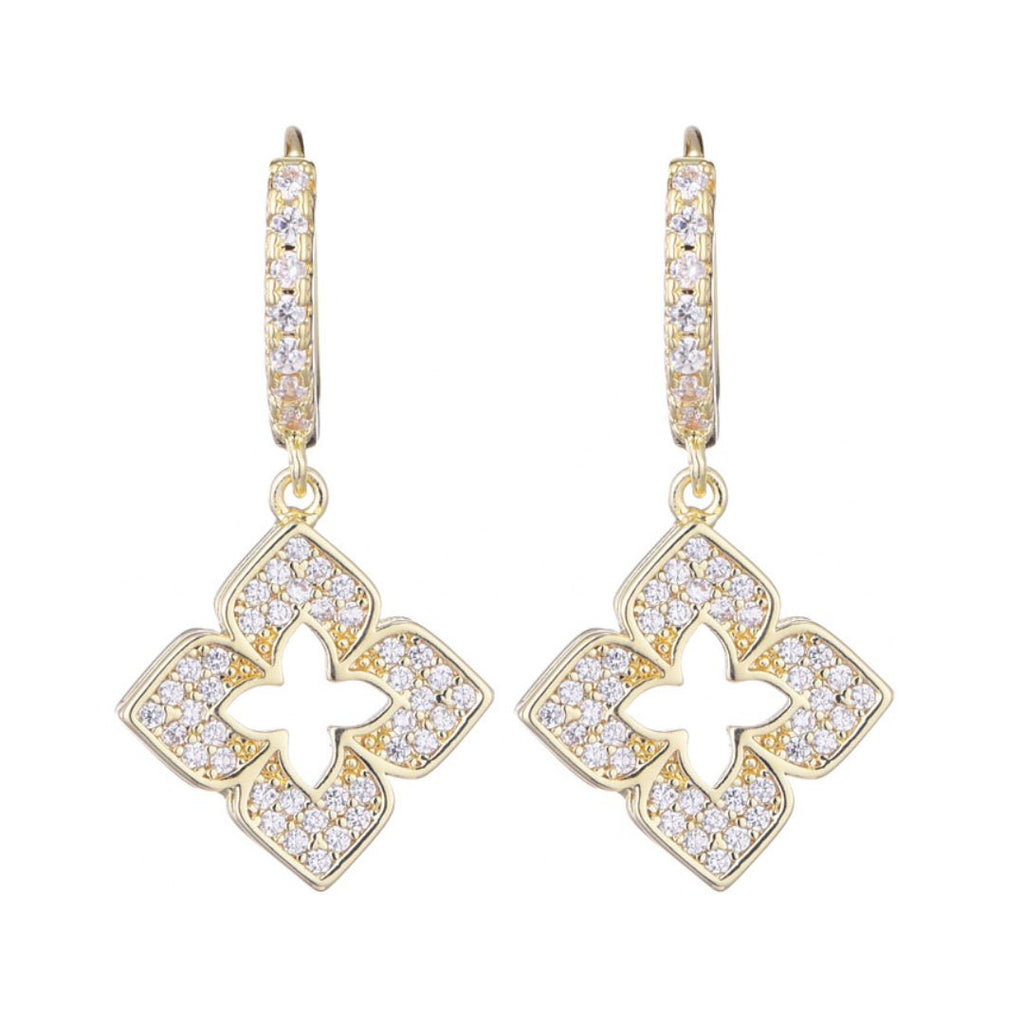 14k Gold Plated CZ Pointed Clover Drop Huggie Hoop Earrings